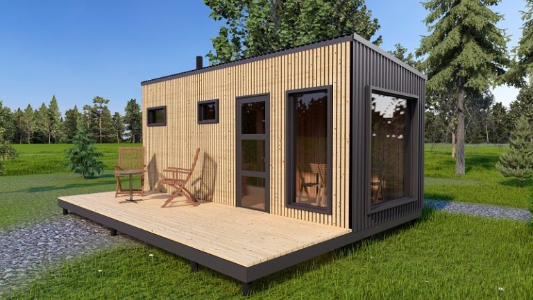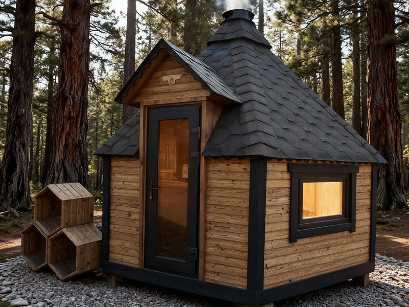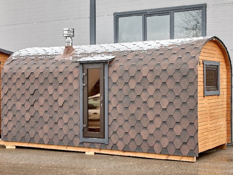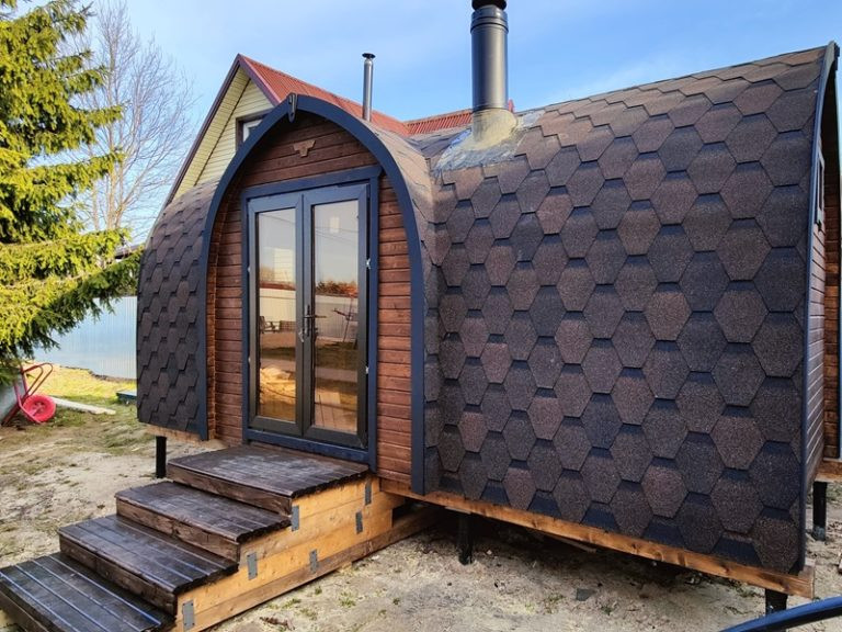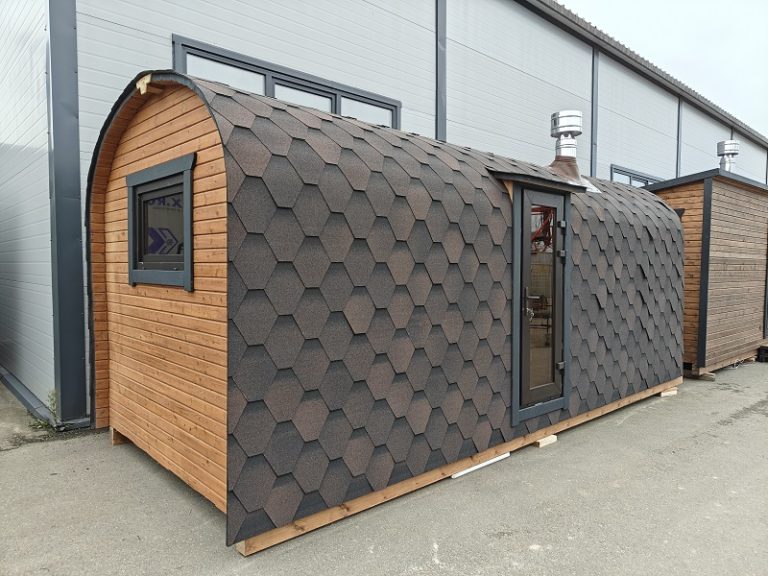 Современное исполнение квадро-бочки — баня «Мини Хаус»: комната отдыха, душевая, парная. Полное покрытие мягкой черепицей. Вынос топки в комнату отдыха и печь с закрытой каменкой для мягкого пара.