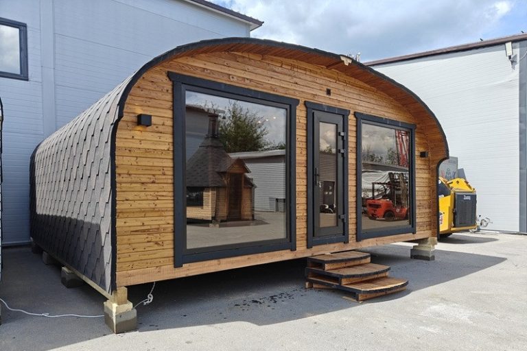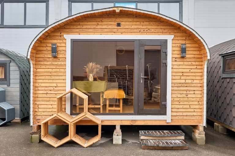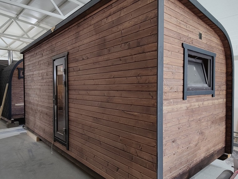 Современное исполнение квадро-бочки — баня «Лайт Хаус» Просторный вариант: 3 помещения с большой комнатой отдыха, душевой с ПНД поддоном и просторной парной с Г-образным полком.